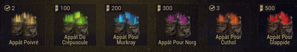 Le prix des appâts varie entre 50 à 500 points de réputation.