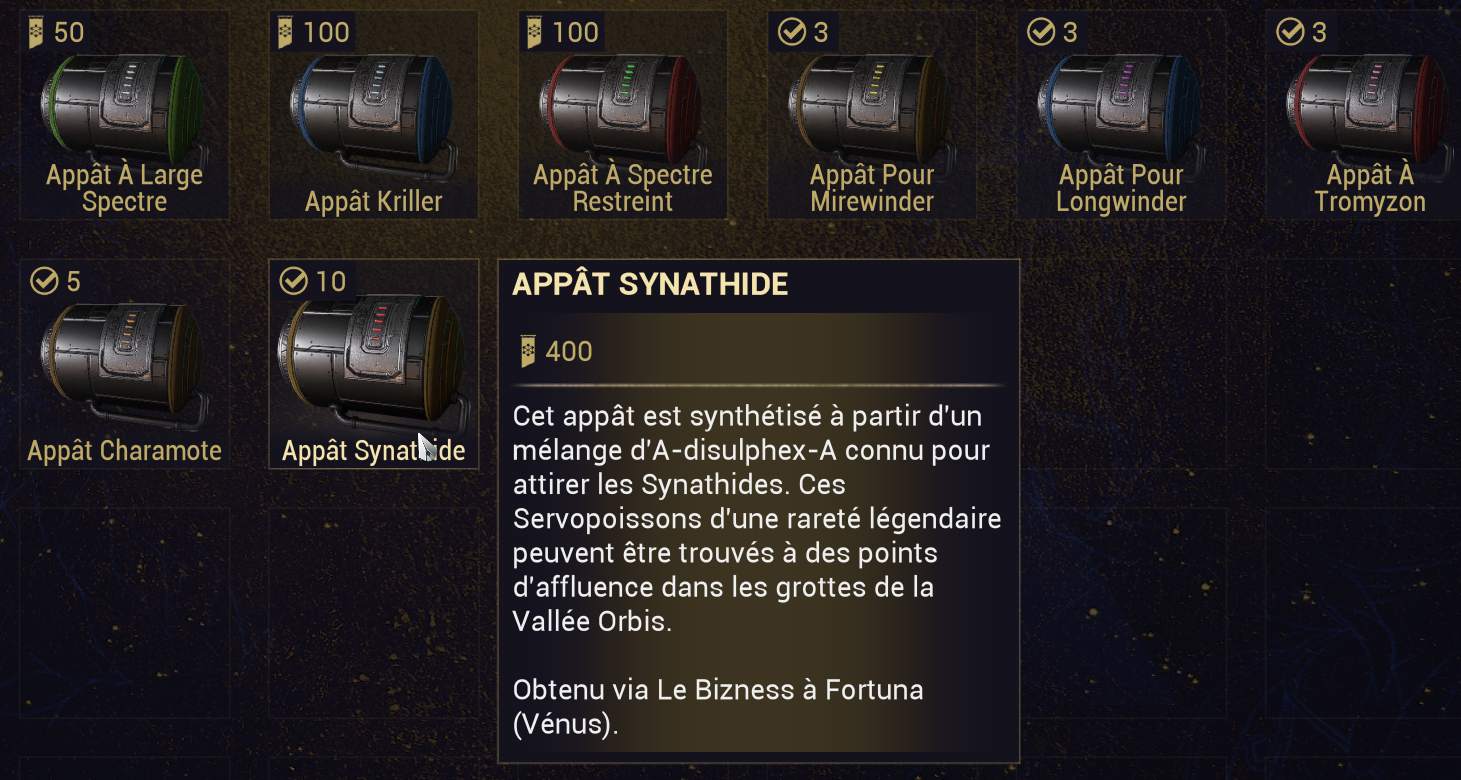 Vous pouvez également acheter à la pêcheuse sur Cetus des Teintures luminescentes à jeter pour mieux discerner les poissons (si vous n’avez pas la sentinelle Oxylus), à 100 points de réputation. Ainsi que des Pharoma, qui calment les poissons une fois jetés (100 points de réputation). Tout cela n’est pas vraiment utile quand vous avez pris le coup de main pour les repérer et jeter le Harpon.