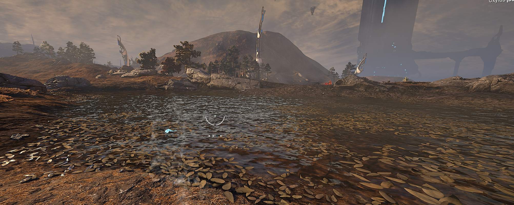 - Vallée d’Orbis : les plans d’eau sont composés de liquide de refroidissement, avec des reflets multicolores. Le Tenno ne peut pas s’y baigner. Si vous tombez dedans, cela fera comme dans les Plaines, vous réapparaitrez à proximité. Les poissons sont mécaniques. Vous trouverez des lacs, des étangs, et des plans d’eau dans certaines grottes :