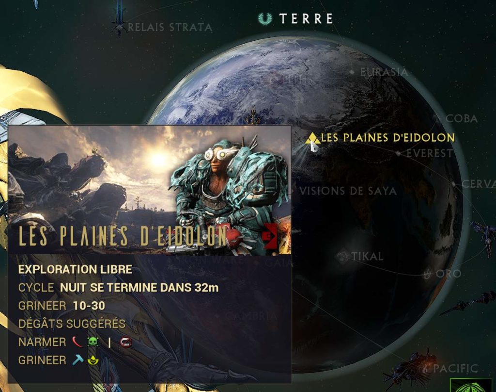 - Jour (100 min) / Nuit (50 min) dans les Plaines d’Eidolon