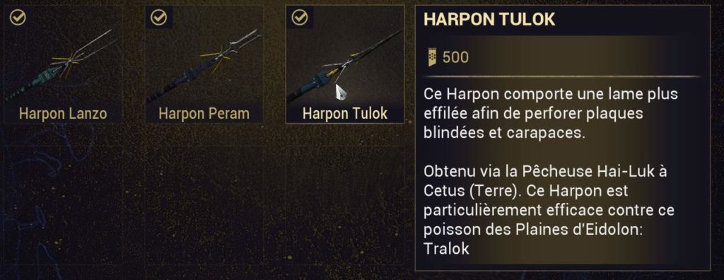 - Les 3 modèles de harpons de Cetus (Lanzo, Peram et Tulok, chacun à 500 points) seront utiles sauf si vous avez ceux de Deimos. Ce premier Harpon Lanzo permet déjà de pêcher beaucoup d’espèces. Le Harpon Peram aussi, différentes. Le Harpon Tulok ne sert que pour une espèce, rare. Les harpons de Cetus peuvent être utilisés dans les 3 mondes ouverts.