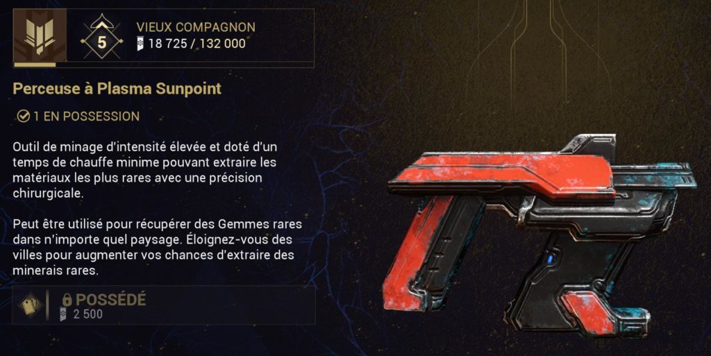 - Son avantage est de pouvoir miner tous les minerais, dans les Plaines d’Eidolon, le Puy de Cambion et la Vallée d’Orbis.