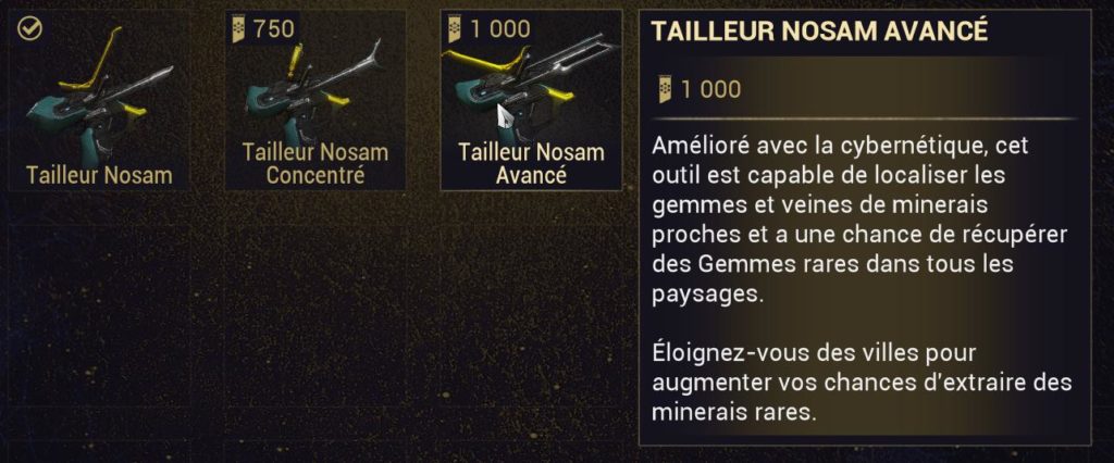 - Sur Cetus : Tailleur Nosam (coût 500 points de réputation, Rang 0 du syndicat Ostron, auprès du Vieux Sumbaat), Nosam concentré (750 points, Rang 2) et Nosam Avancé (1000 points, Rang 4). Ces deux derniers montent en portée de minage et en probabilité d’avoir des gemmes rares mais ils sont inutiles si vous avez la Perceuse à plasma Sunpoint.